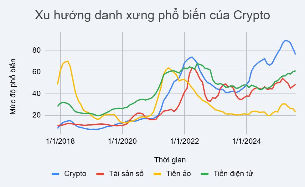 - 2021-2023: “Crypto”, “Tiền điện tử” và “Tài sản số” cho mức độ quan tâm cao trong khi “Tiền ảo” bắt đầu suy giảm mạnh