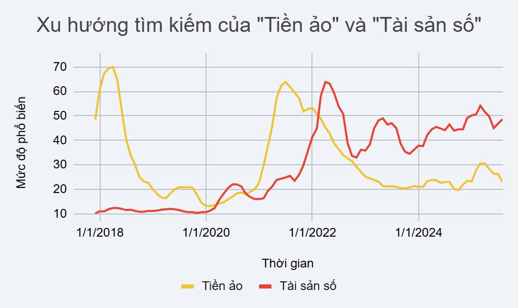 Đến giai đoạn sau, xuất hiện sự dịch chuyển khái niệm sang “tài sản số” trong các văn bản cấp cao như QĐ 194 yêu cầu khung với VA/VASP; và đặc biệt là Luật Công nghiệp Công nghệ số 2025 chính thức định nghĩa “tài sản số” trong luật. Nhờ đó, từ khóa “tài sản số” từ mức thấp trước 2021 đã bứt phá nhanh, nổi lên trong nhóm top chủ đề tài chính được tìm kiếm.